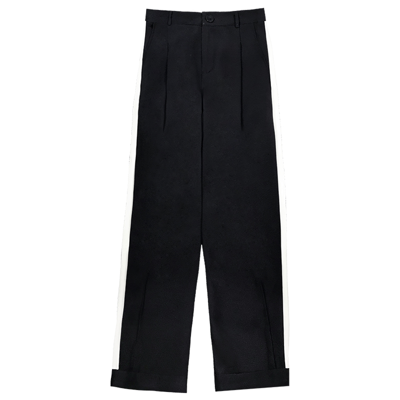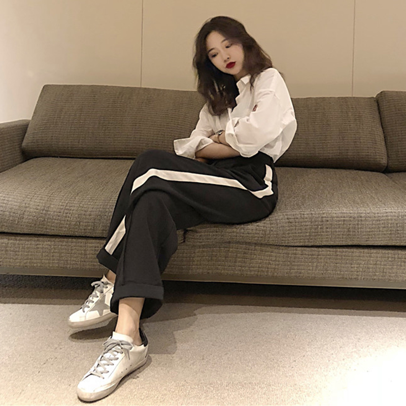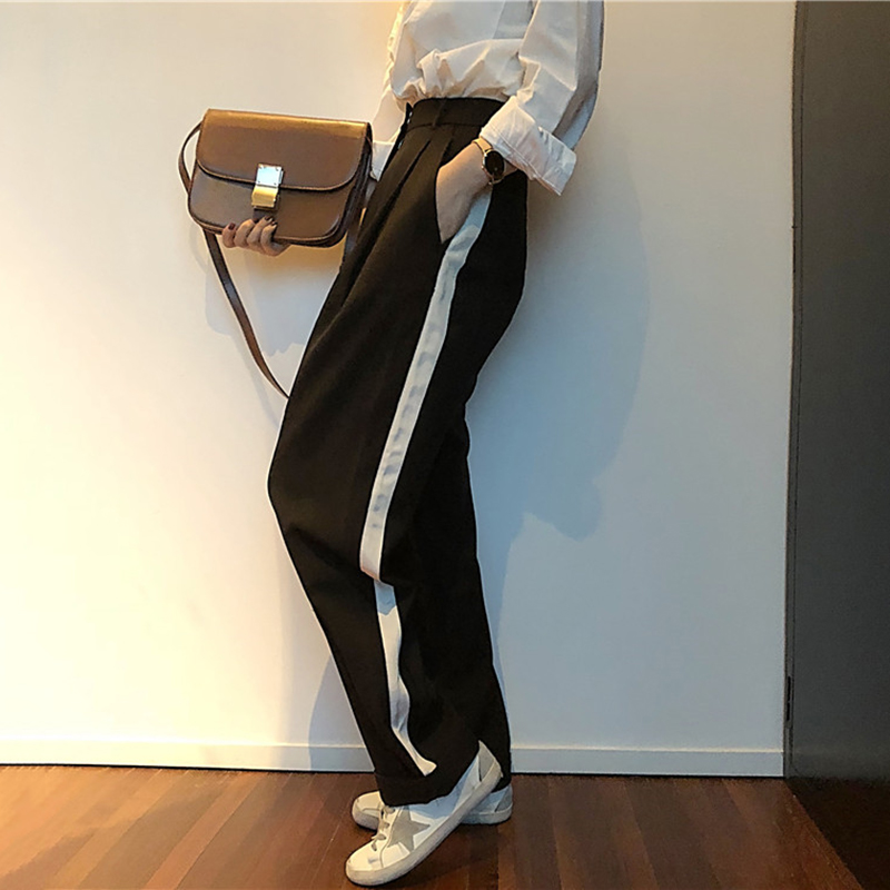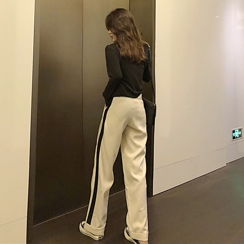 / 港風直筒運動褲女秋冬裝2018新款高腰顯瘦側邊撞色休閑闊腿長褲子