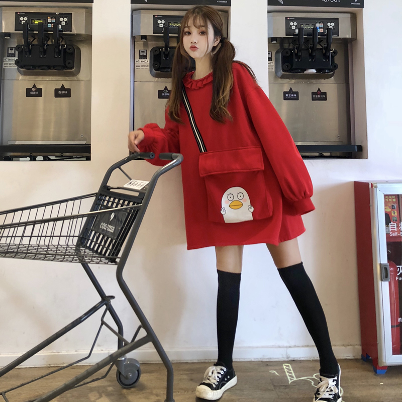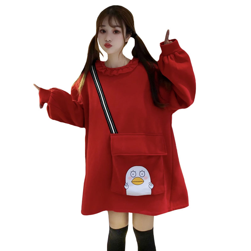 / 2018新款秋冬女裝韓版寬松中長款卡通大口袋加絨加厚套頭衛衣外套