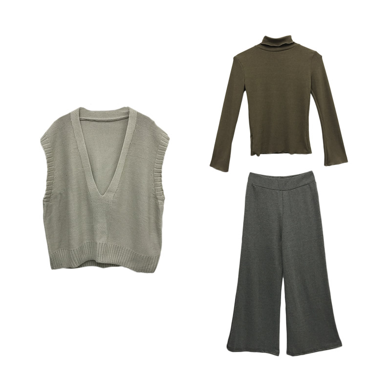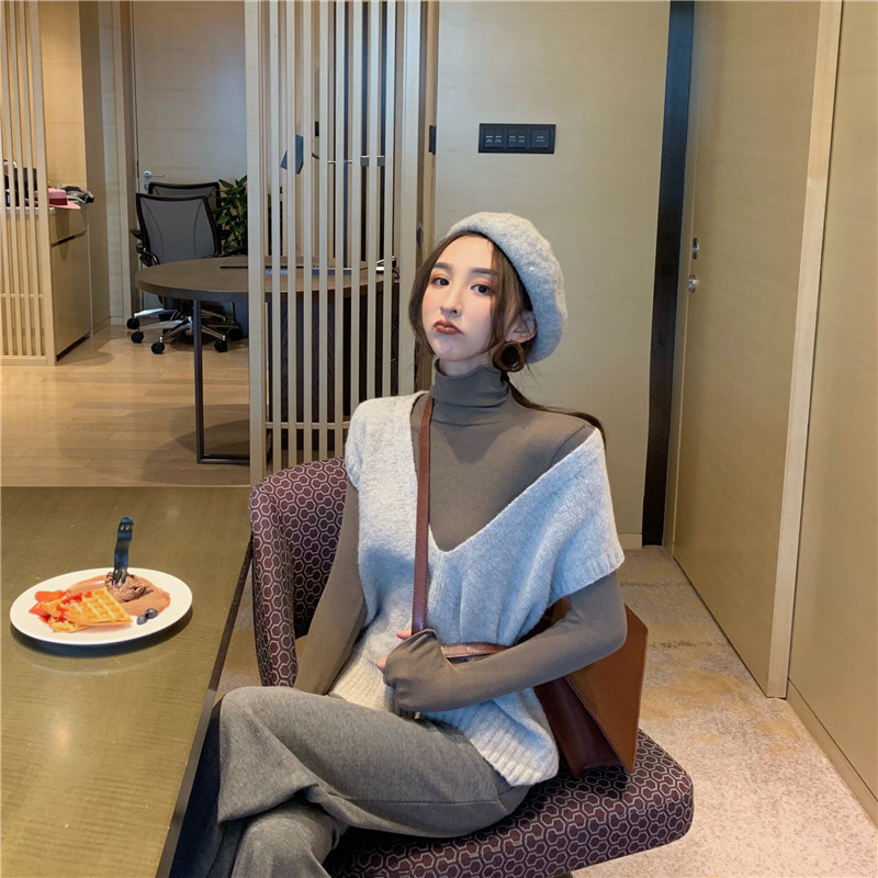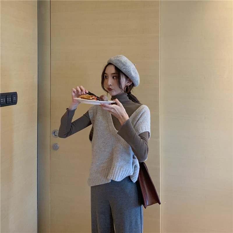 / 秋裝女2018新款套裝復古針織毛衣背心+高領打底+純色闊腿褲三件套