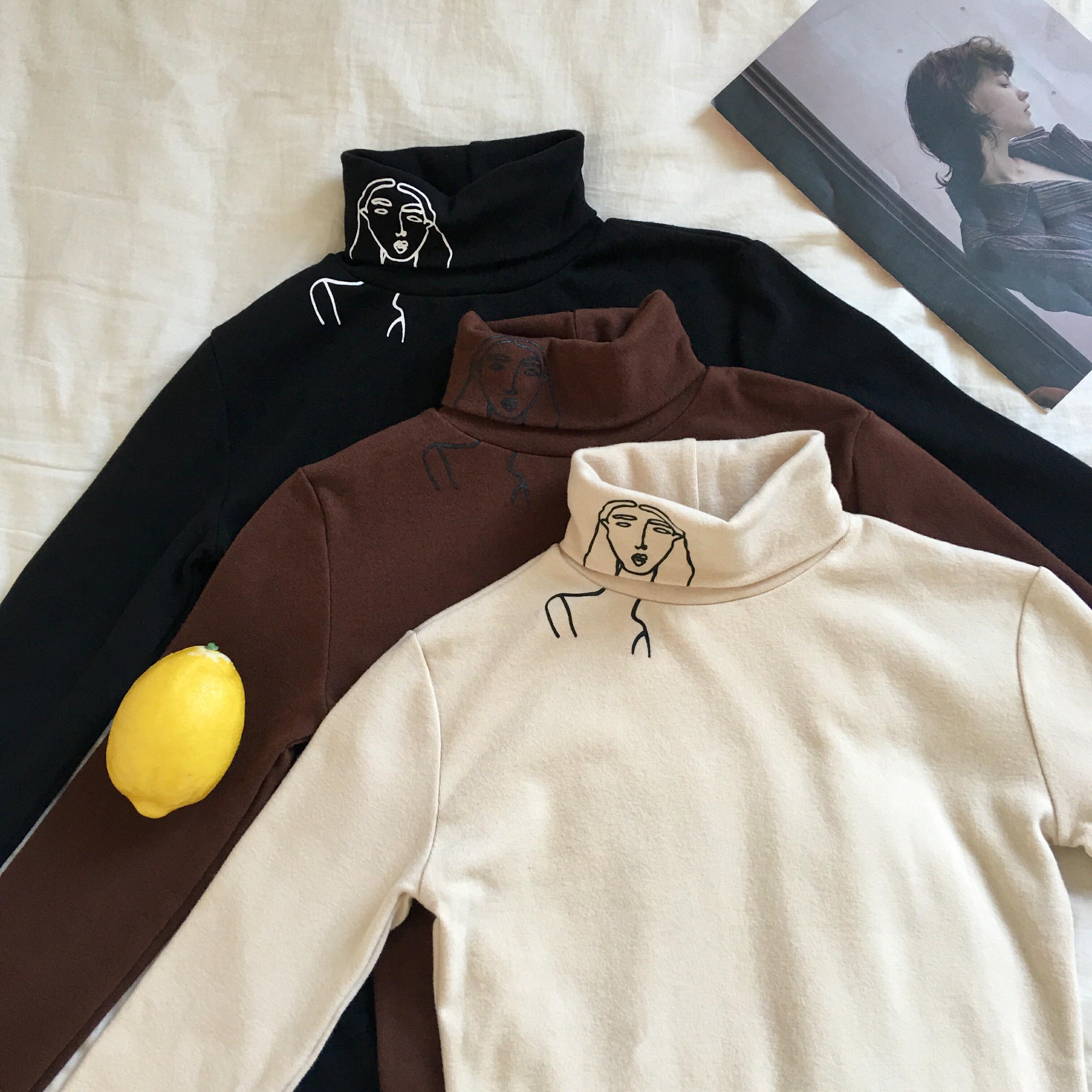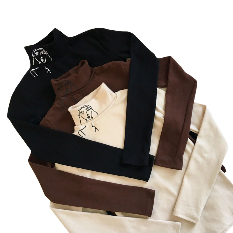 / 秋季韓版chic復古百搭個性人頭高領長袖打底衫修身顯瘦T恤上衣女