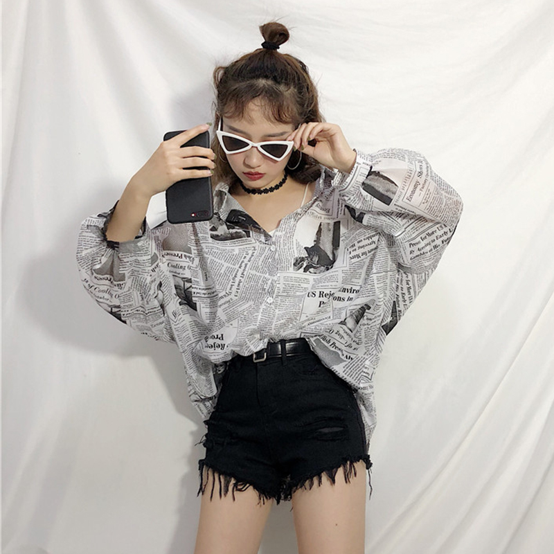 / 秋裝女新款港味個性復古報紙印花襯衫休閑中長款寬松蝙蝠長袖上衣