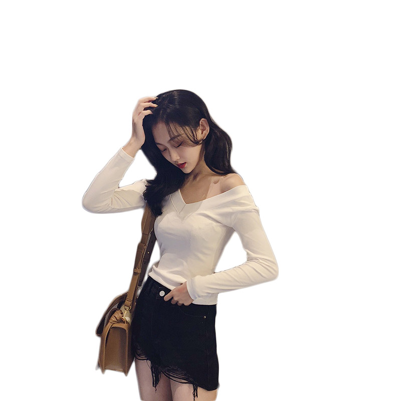 韓版時尚秋裝女2018新款黑白拼接打底T恤露肩設計款修身顯瘦上衣