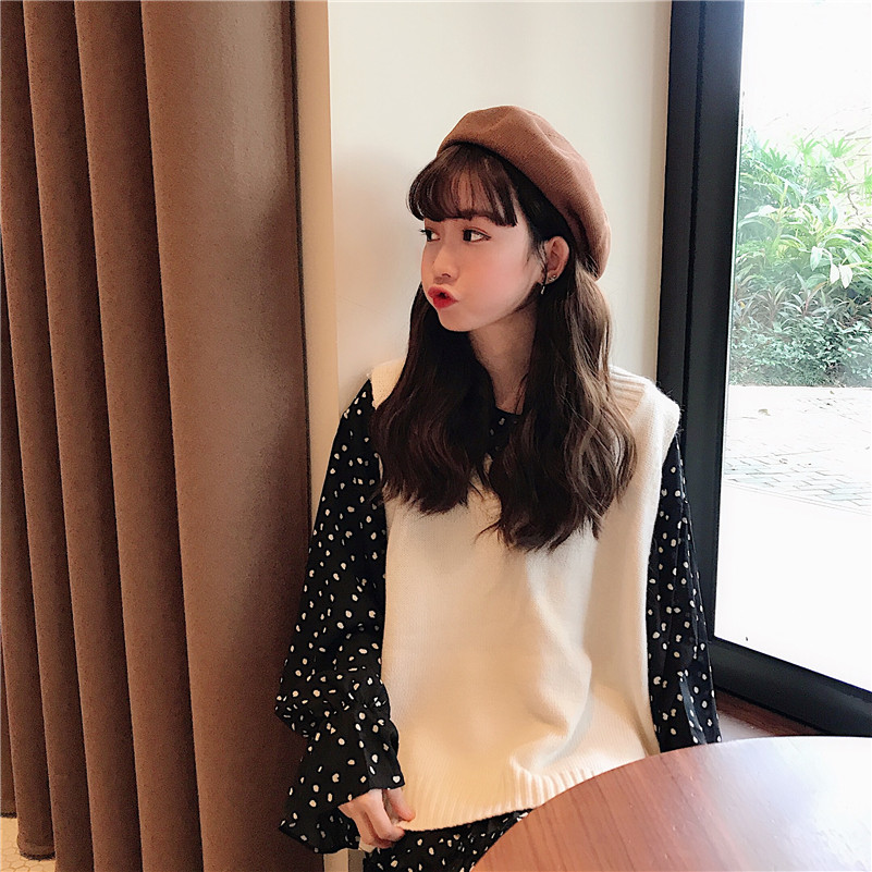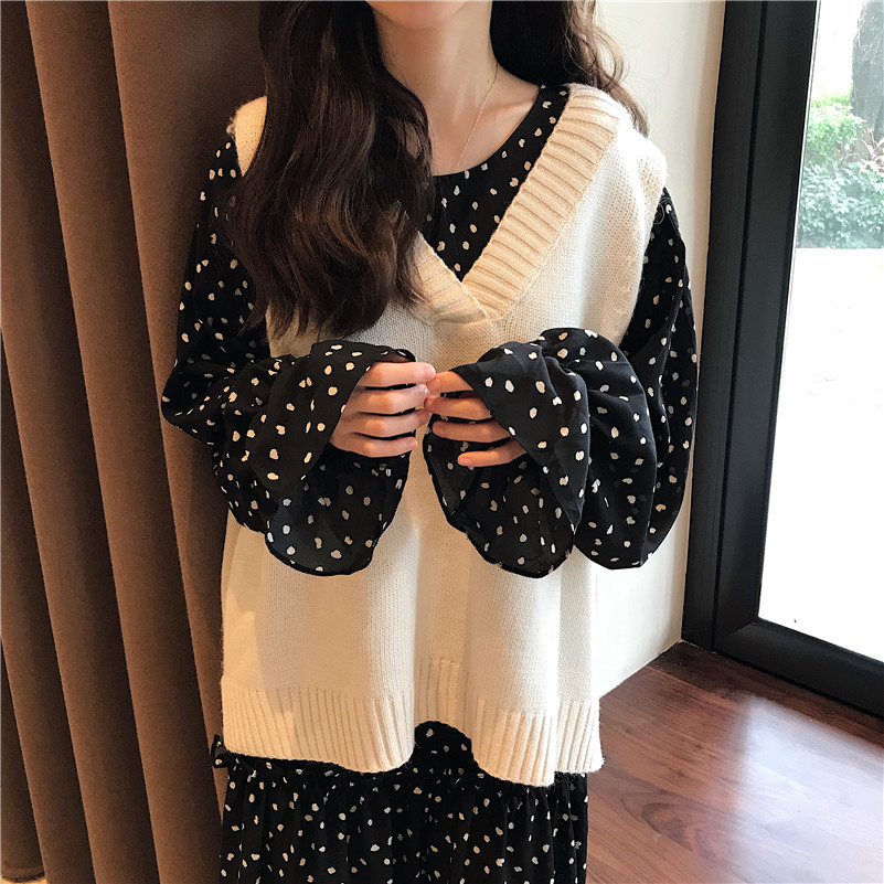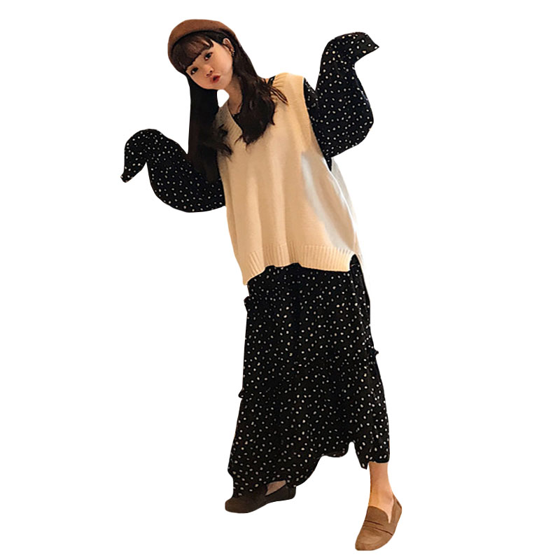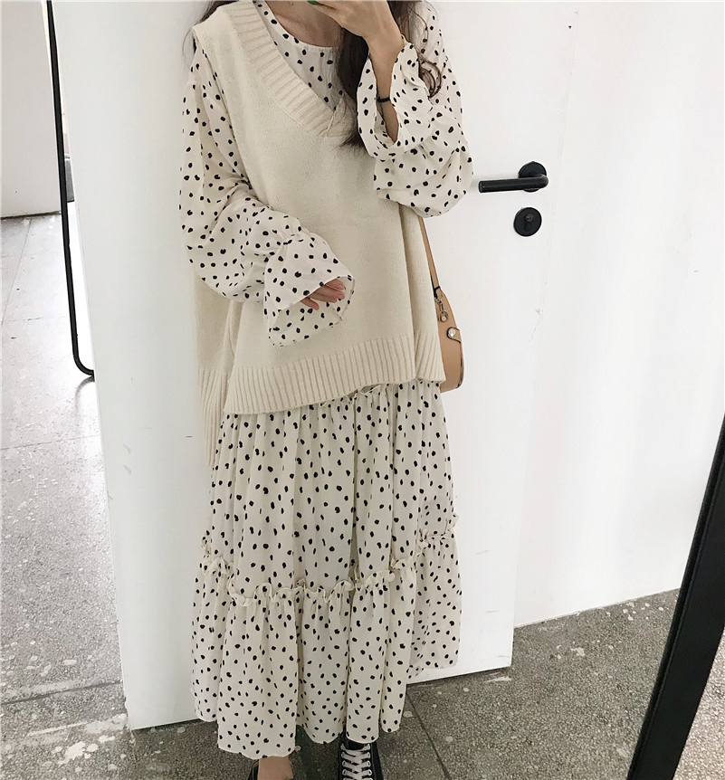/ 韓版時尚休閑套裝秋季女裝波點連衣裙長裙+V領針織馬夾背心兩件套