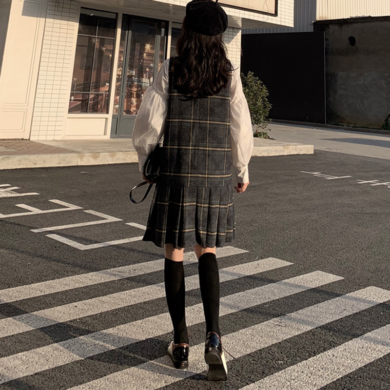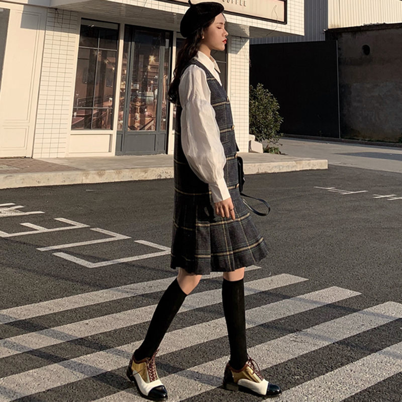 御姐套裝女秋冬新款學生復古V領格子連衣裙網紗寬松長袖襯衫上衣