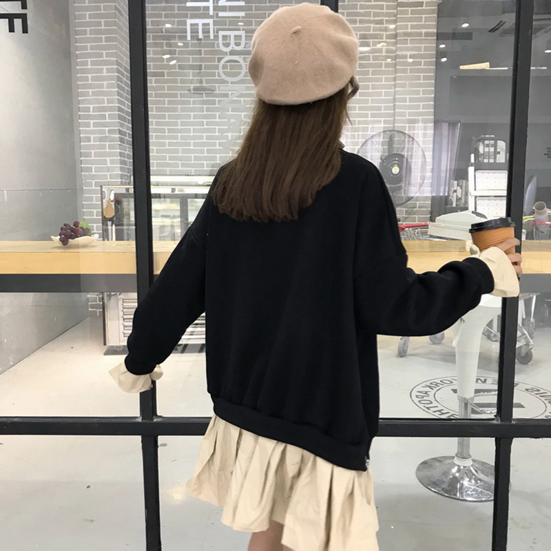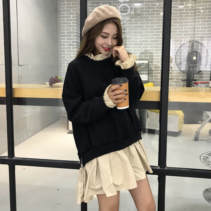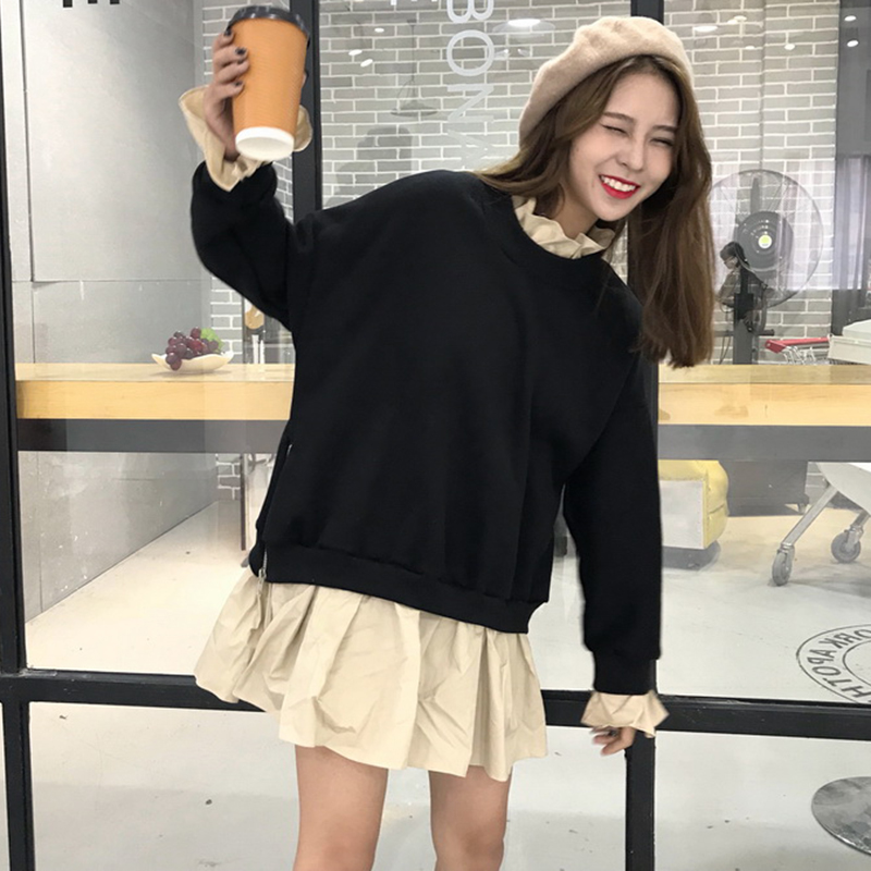 2018秋裝女新款韓版寬松假兩件側拉鏈長袖拼接中長款木耳邊衛衣裙