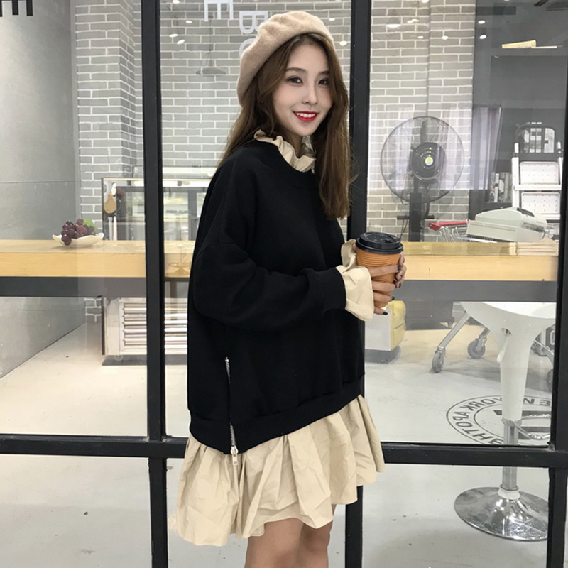 / 2018秋裝女新款韓版寬松假兩件側拉鏈長袖拼接中長款木耳邊衛衣裙