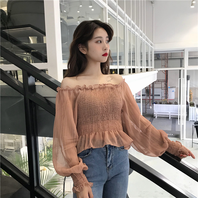秋裝女2018新款一字肩燈籠泡泡袖女士白色蕾絲雪紡長袖上衣拼接衫