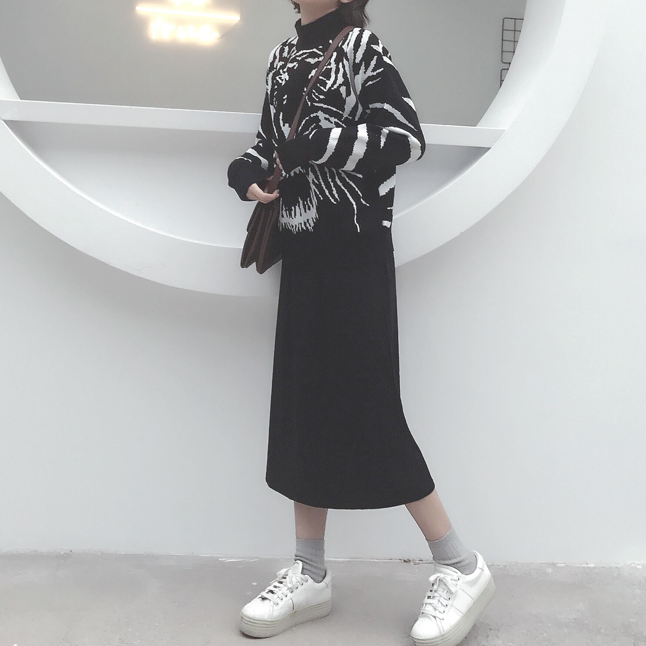 復古港風chic早秋針織衫個性虎頭半高領虎紋百搭寬松長袖毛衣女潮