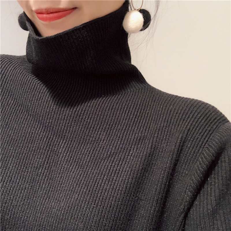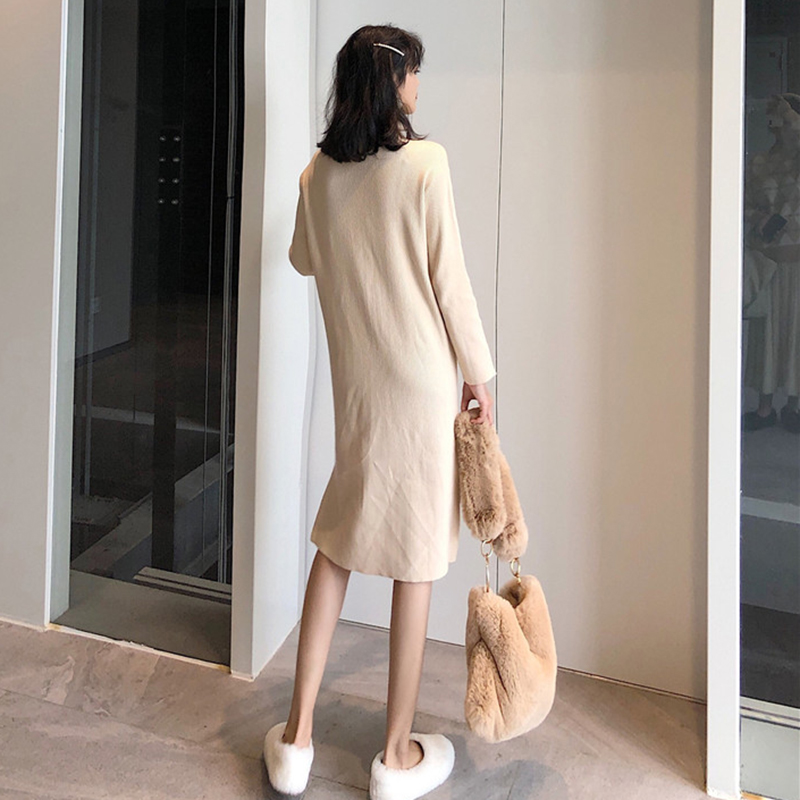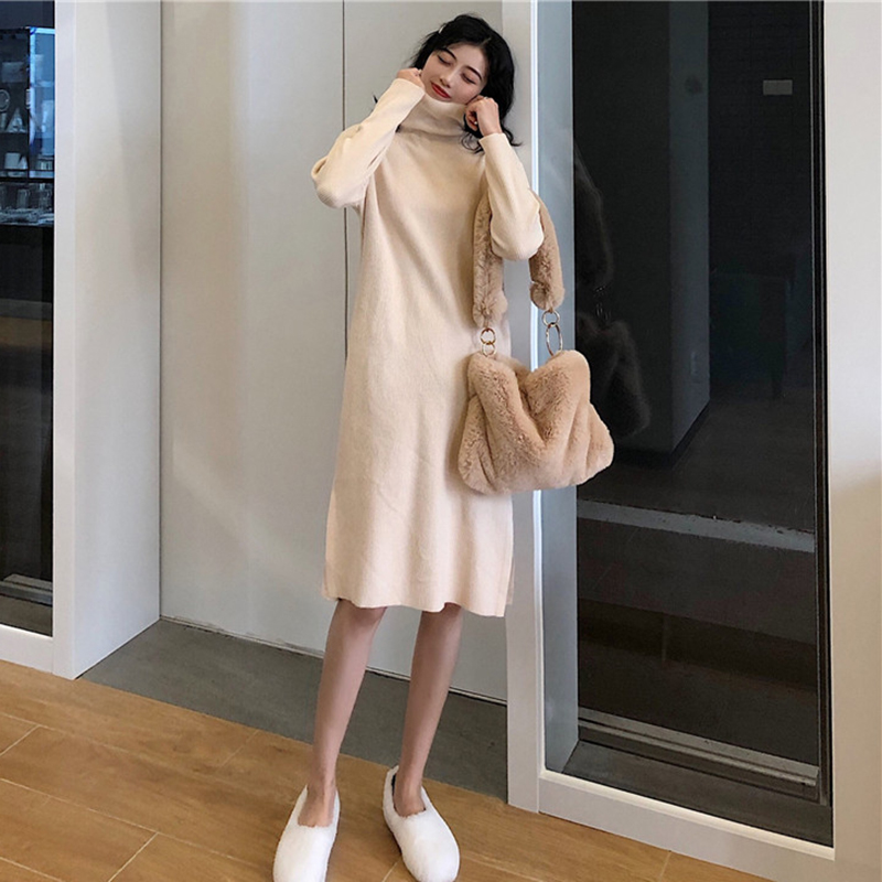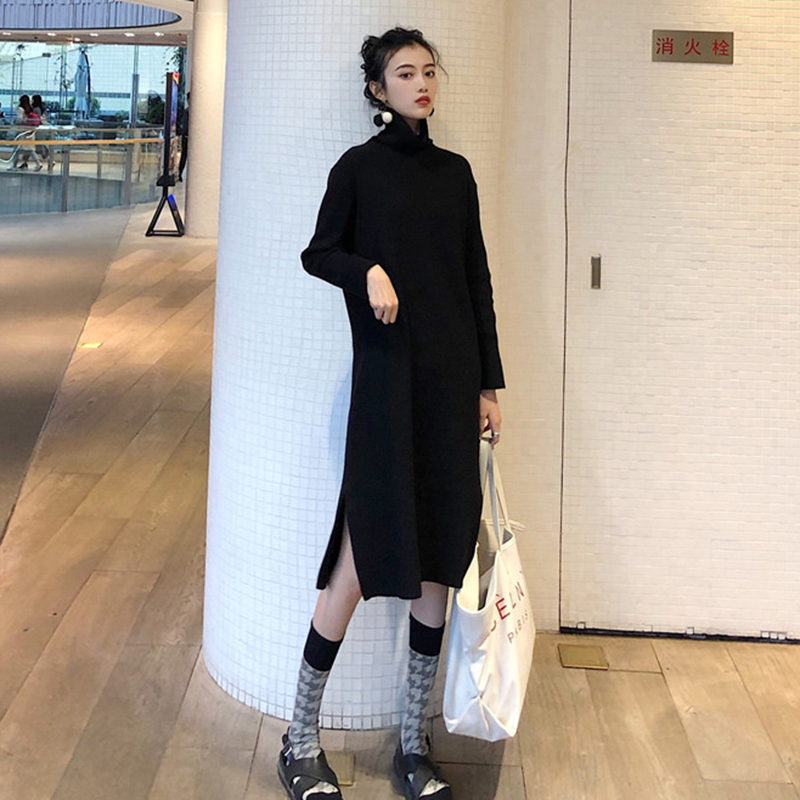 秋冬2018新款女裝韓版高領針織打底中長裙開叉egg風長袖連衣裙子