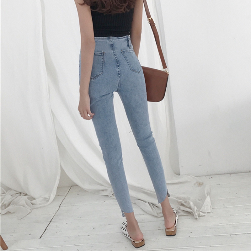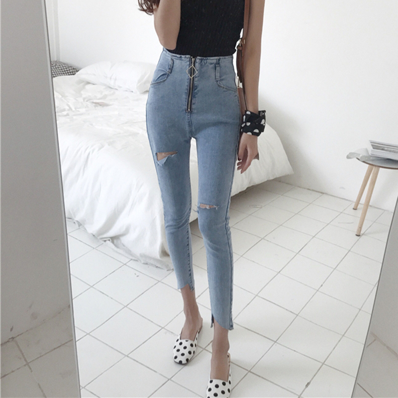 / 九分褲女夏新款韓版女裝拉鏈高腰修身鉛筆褲不規則褲腳破洞牛仔褲