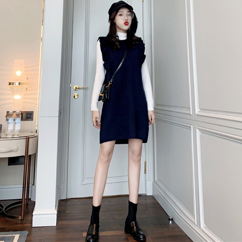 / 氣質女神兩件套秋冬裝新款中長款荷葉邊背心裙修身高領打底針織衫
