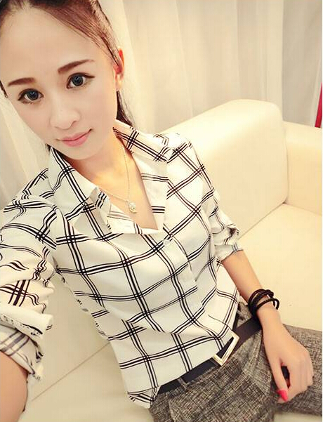 / 女裝2018早春新款印花格子襯衫女長袖學生裝韓范修身百搭雪紡襯衣