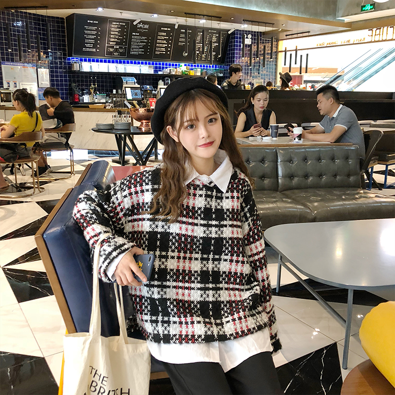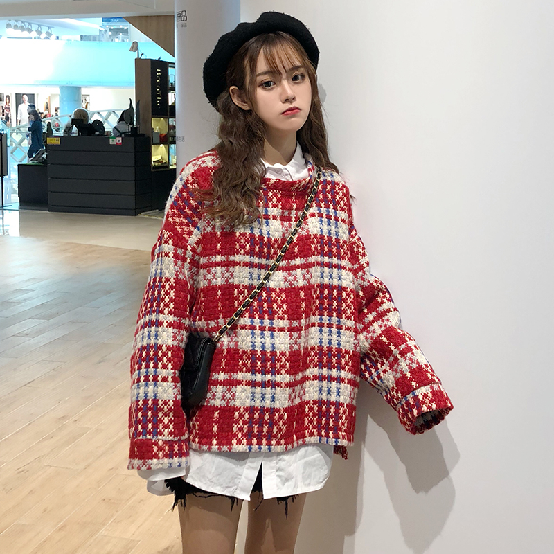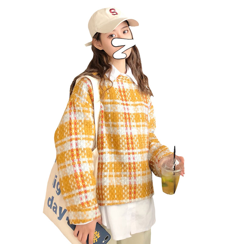 / 秋冬韓版學院風寬松格子呢子套頭超火衛衣上衣外套+中長款襯衫女