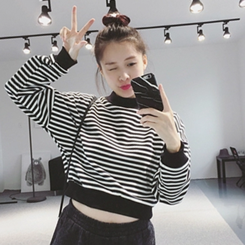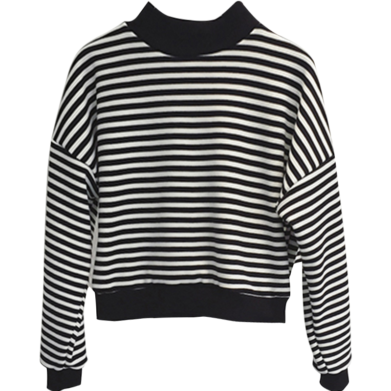 衛衣2018新款女長袖 韓版 寬松顯瘦高領黑白條紋加絨衛衣冷系女裝