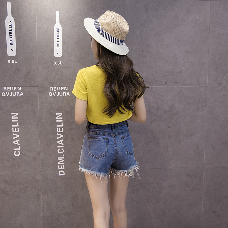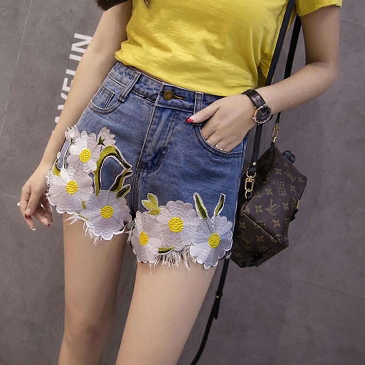 / 牛仔短褲女韓版夏高腰刺繡短褲繡花顯瘦闊腿褲毛邊花朵破洞熱褲
