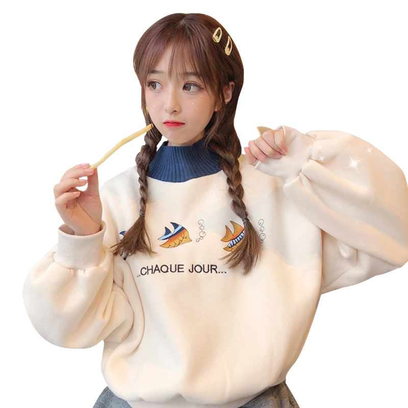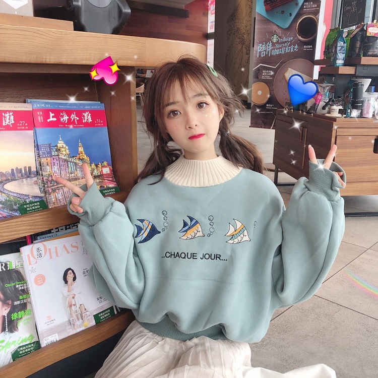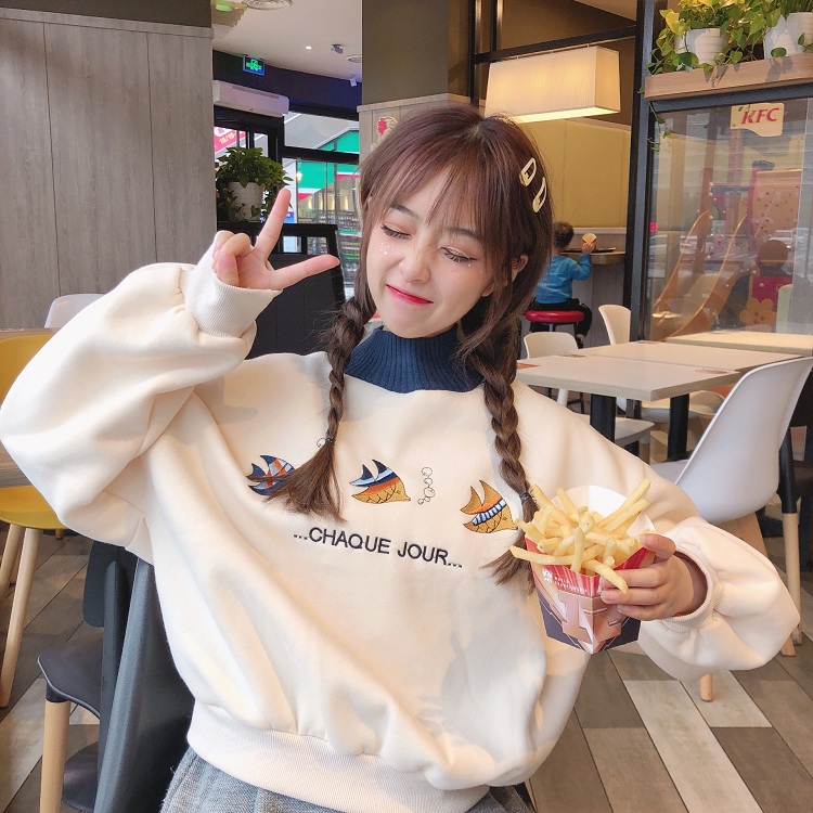 / 秋冬韓版短款寬松卡通刺繡拼接半高領加絨加厚套頭衛衣上衣外套女