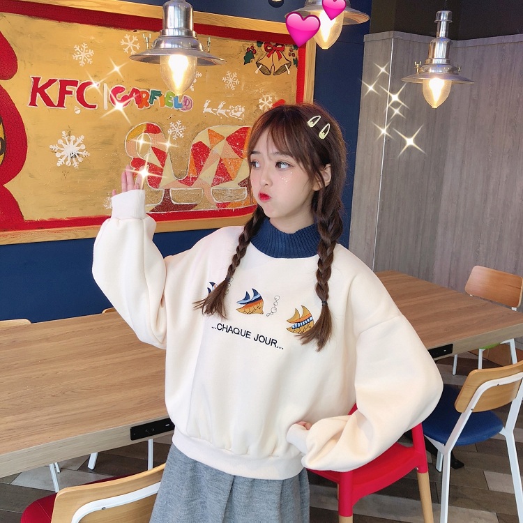 秋冬韓版短款寬松卡通刺繡拼接半高領加絨加厚套頭衛衣上衣外套女