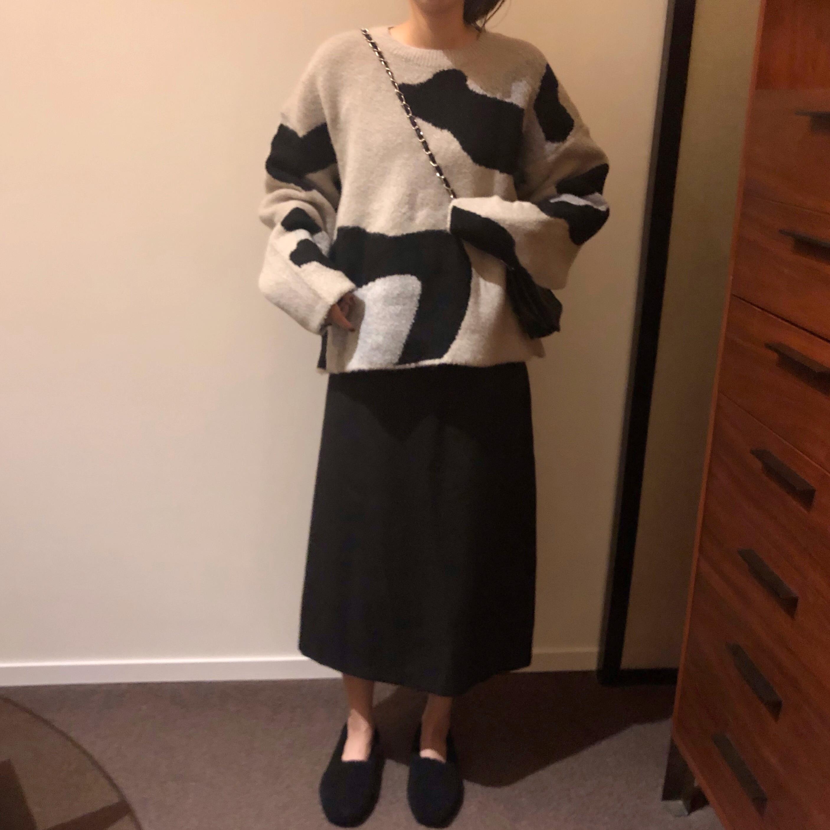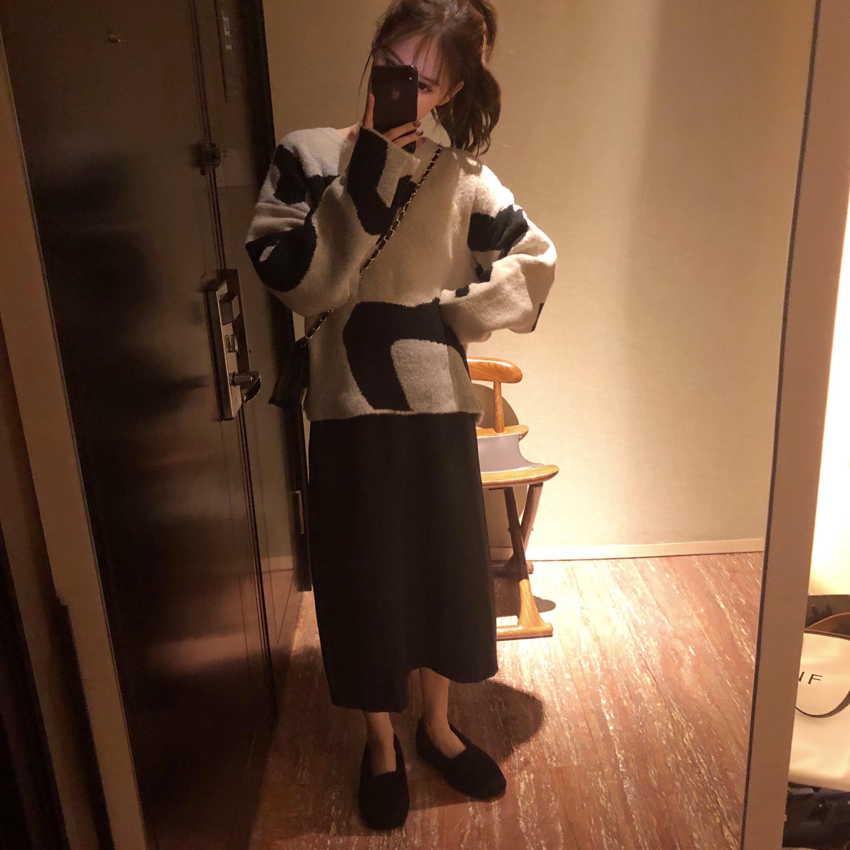 / 冬韓版套頭保暖厚寬松奶牛毛衣上衣時尚套裝純色顯瘦開叉半身裙女