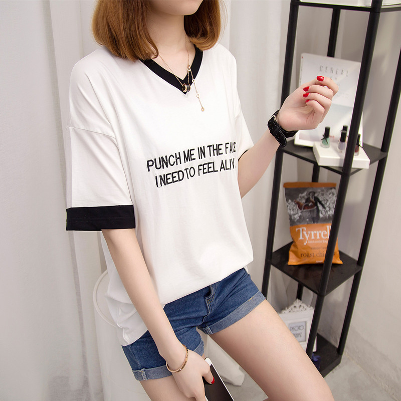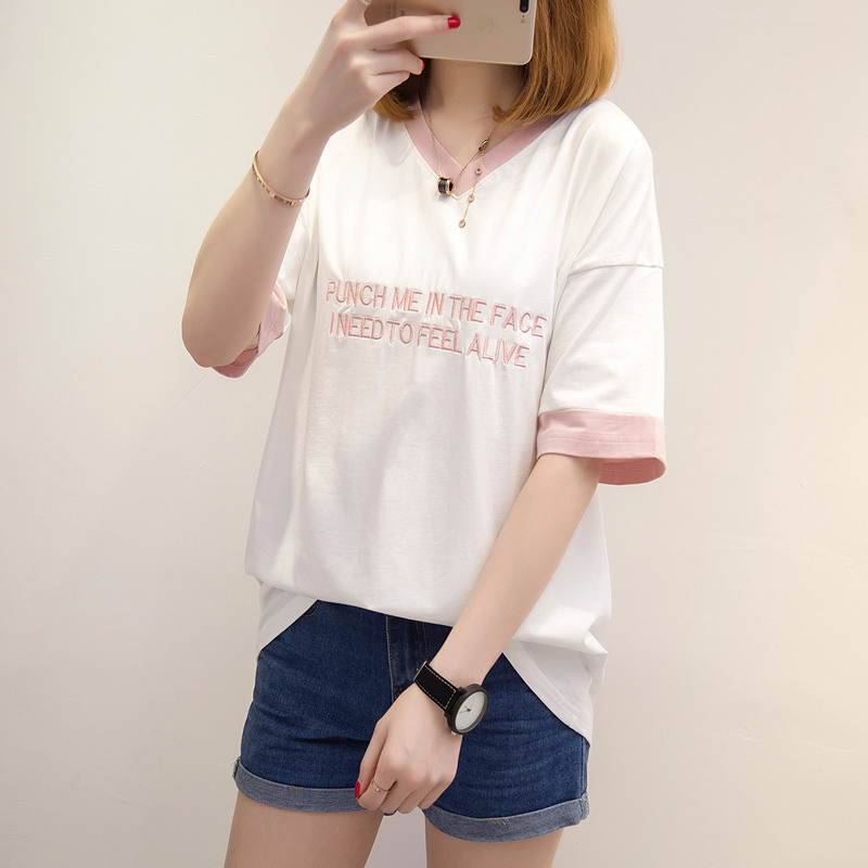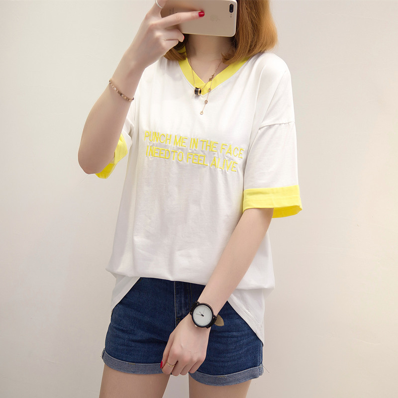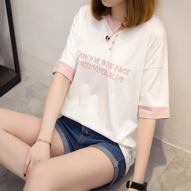 短袖上衣女夏新款女裝寬松拼色V領短袖t恤女韓版體恤小衫百搭