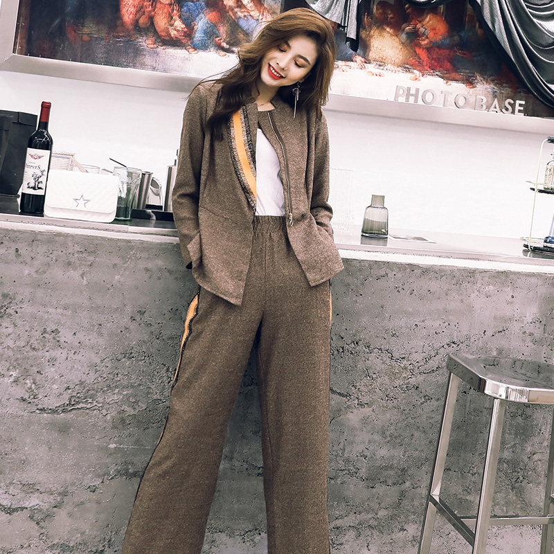 / 歐洲站2018秋冬裝新款收腰時尚休閑長袖外套闊腿褲套裝洋氣兩件套