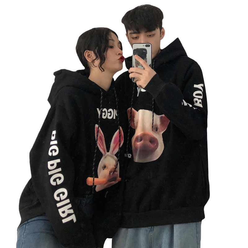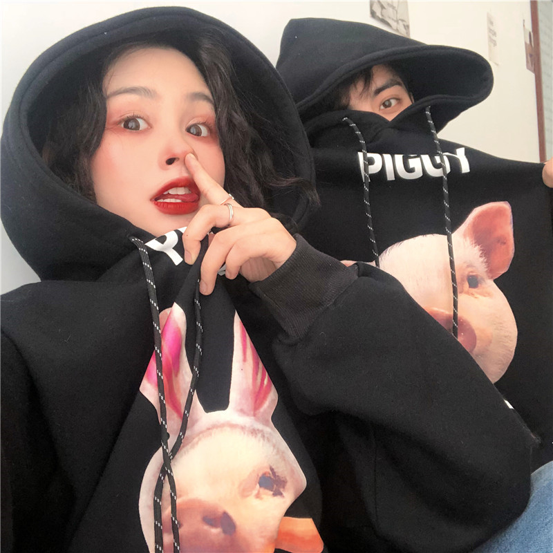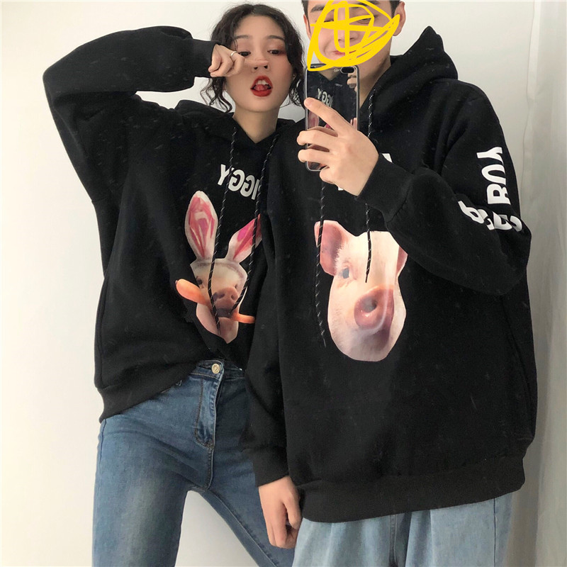 / 秋冬女裝韓版中長款原宿風卡通豬豬字母情侶連帽加厚衛衣上衣外套