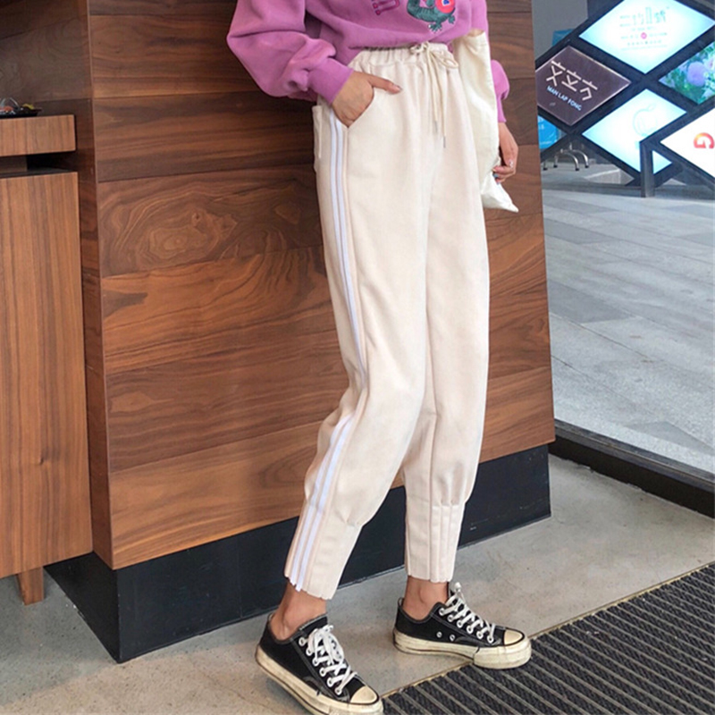 學生高腰休閑褲女秋冬裝2018新款韓版寬松顯瘦側面雙杠哈倫褲子潮