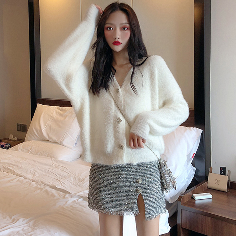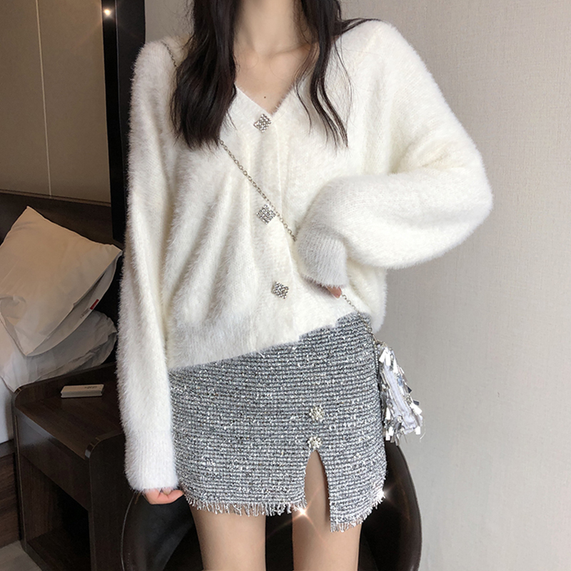 女神套裝秋2018新款慵懶毛衣外套長袖毛絨開衫高腰開叉銀絲半身裙
