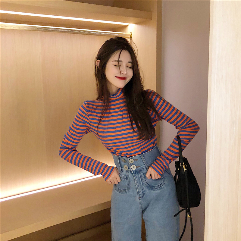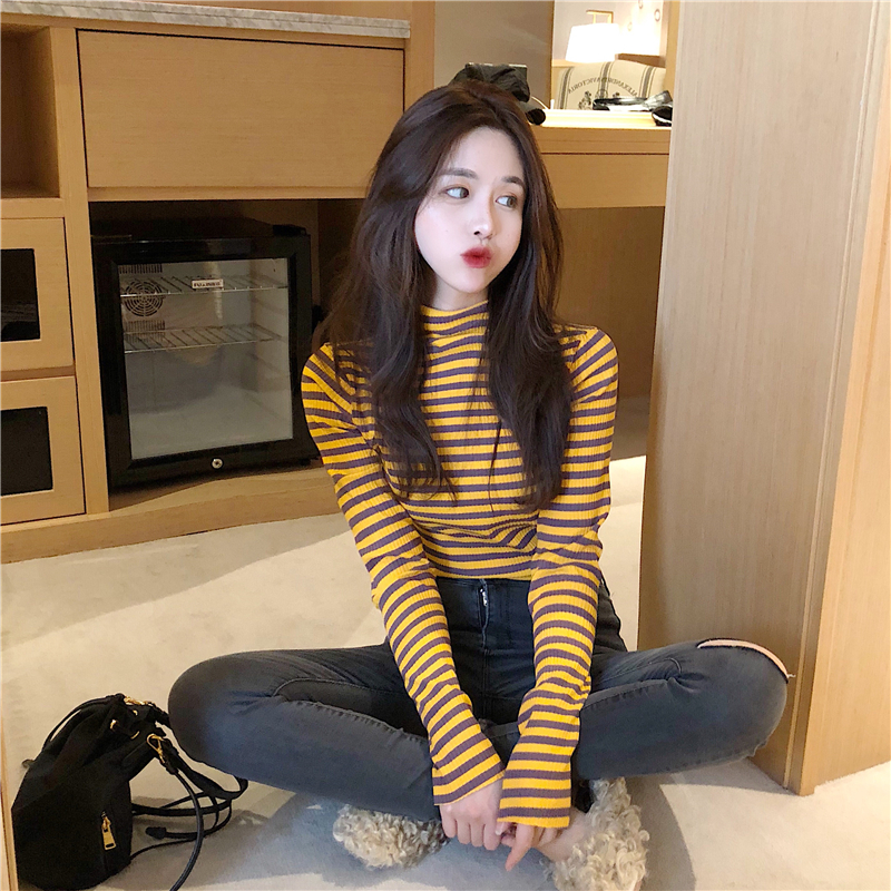 秋裝女2018新款韓版修身顯瘦條紋高領打底衫長袖T恤港風百搭上衣