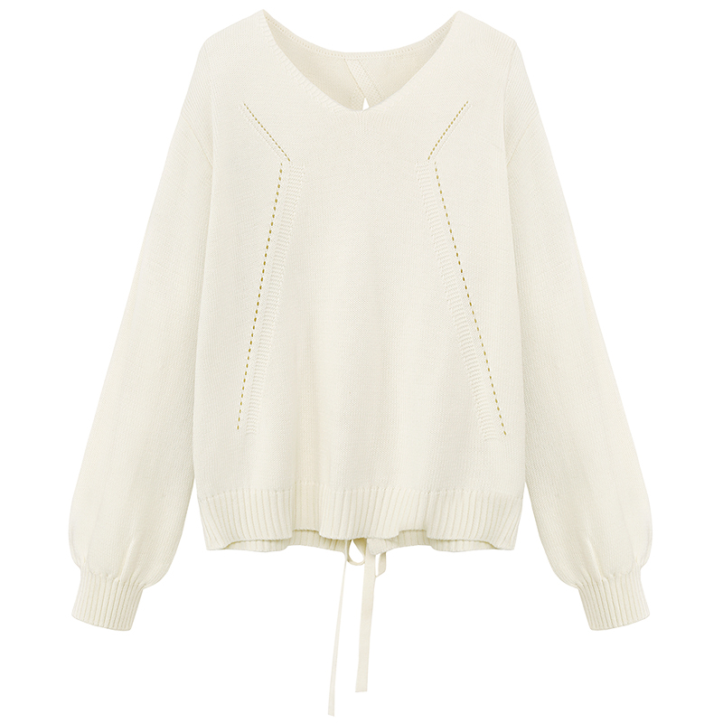 MG小象白色毛針織衫女秋冬新款寬松長袖鏤空上衣學生v領套頭毛衣