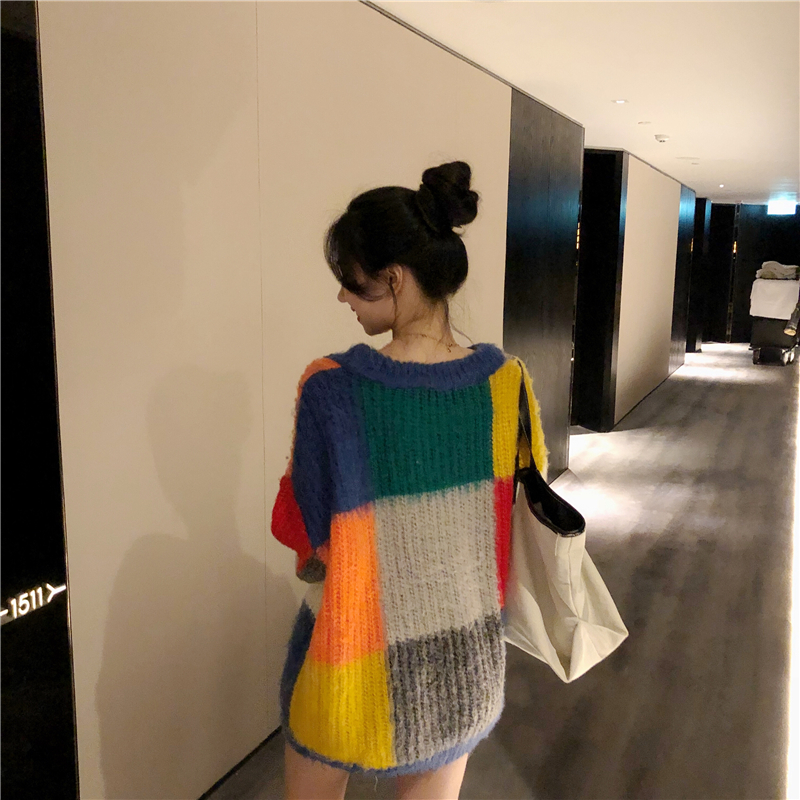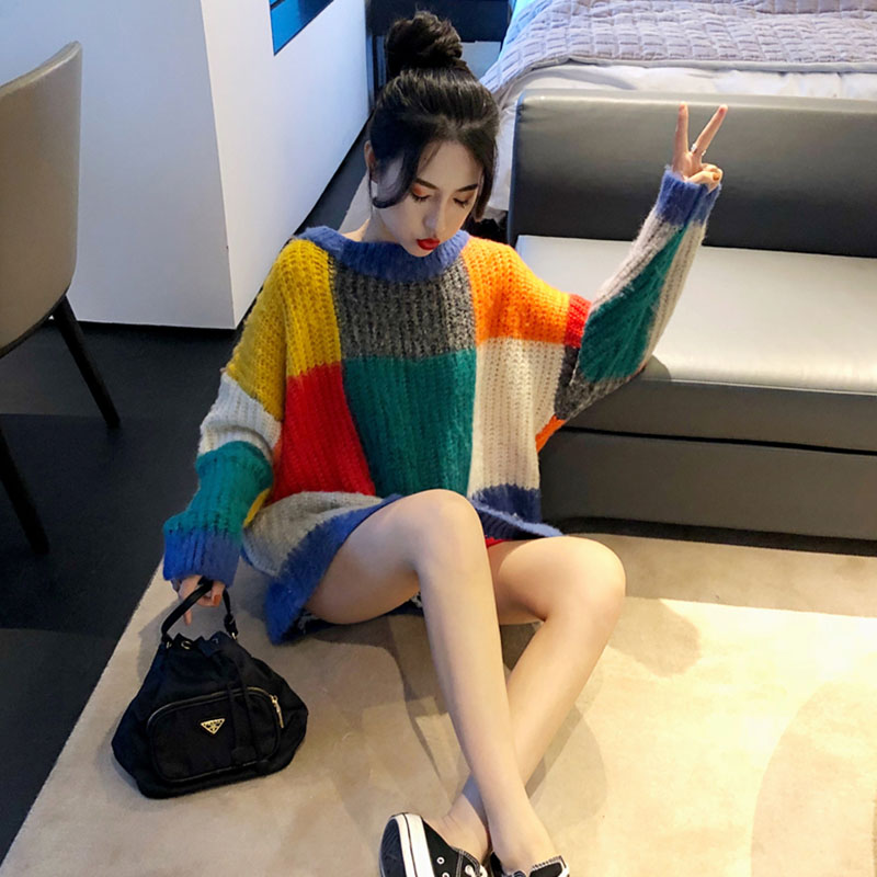 / 慵懶加厚彩虹撞色格子網紅毛衣女2018新款時尚百搭套頭針織毛線衫
