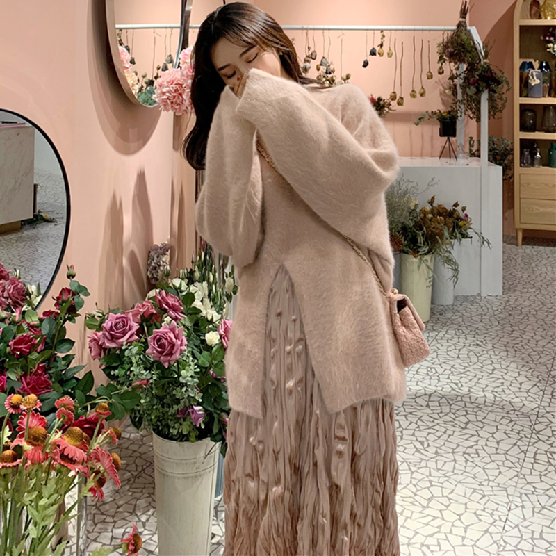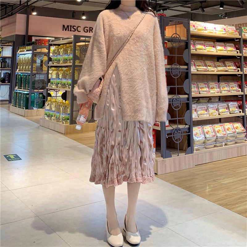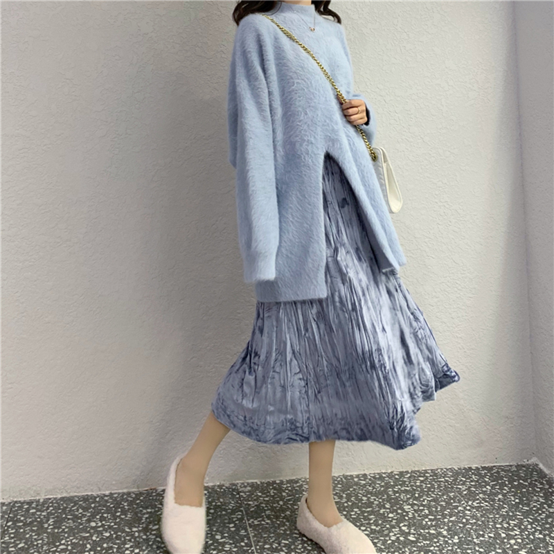毛衣配裙子兩件套冬裝新款寬松開叉套頭針織衫高腰褶皺絲絨半身裙