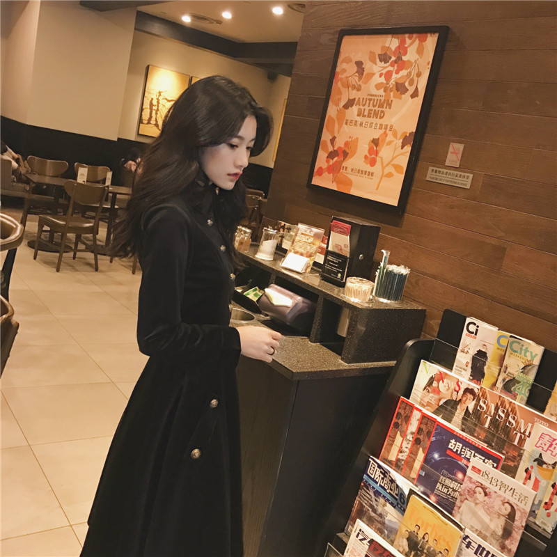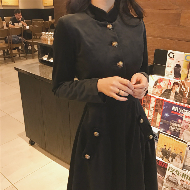 / 韓版時尚秋裝女2018新款百搭立領絲絨長袖黑色外套裙子【加里布】