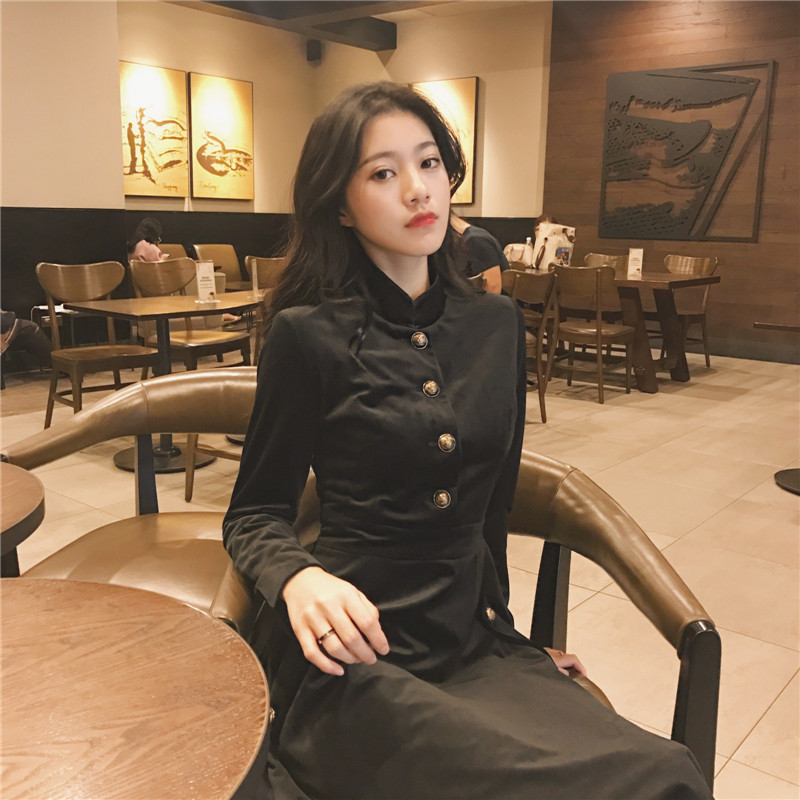 韓版時尚秋裝女2018新款百搭立領絲絨長袖黑色外套裙子【加里布】