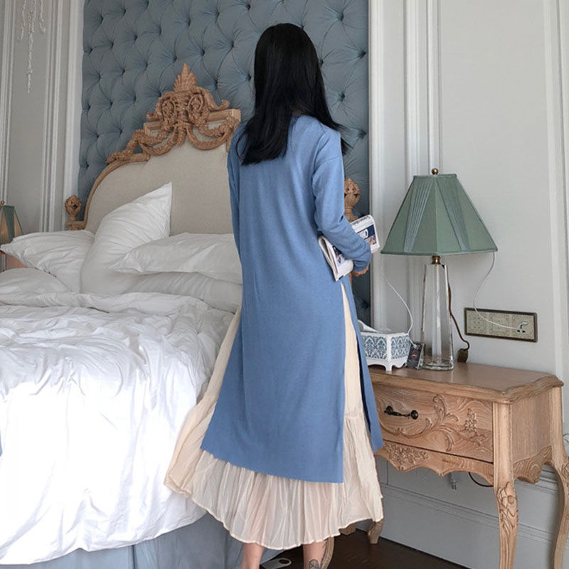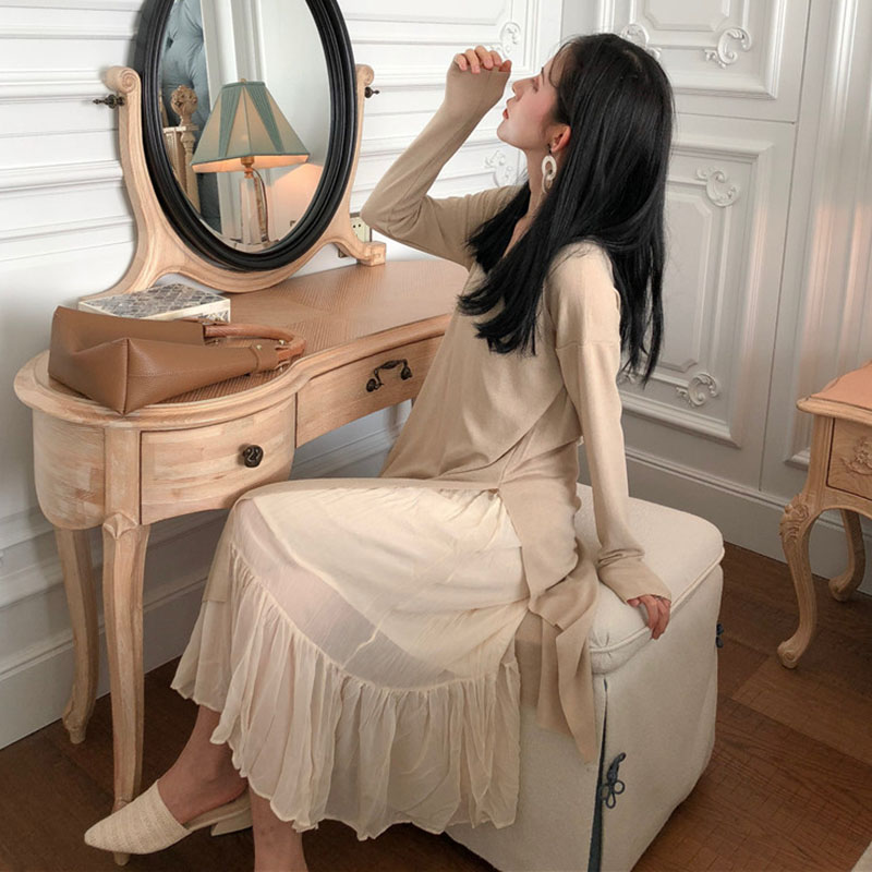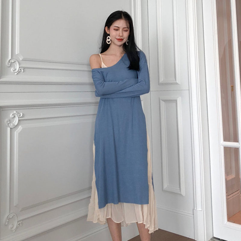 / 晚晚風兩件套秋裝女2018新款雪紡吊帶連衣裙外搭長袖開叉中長裙子