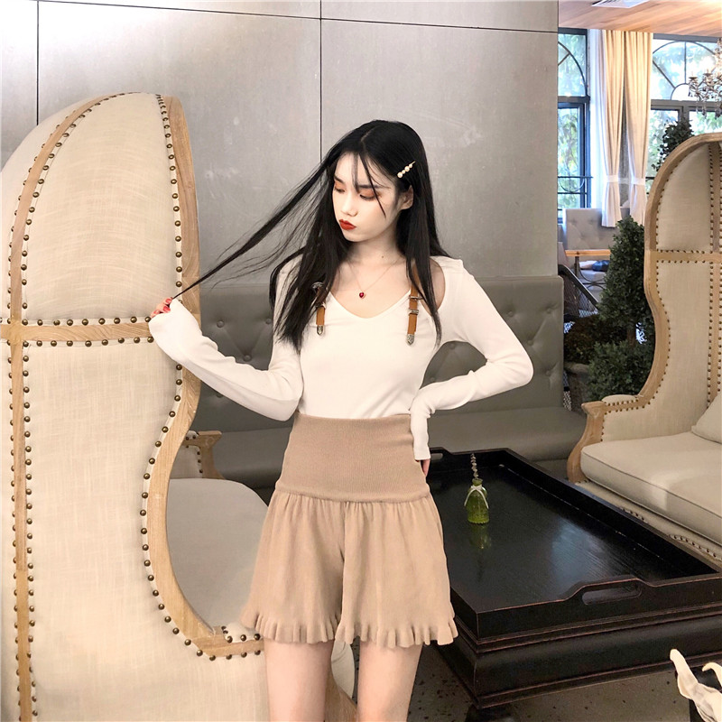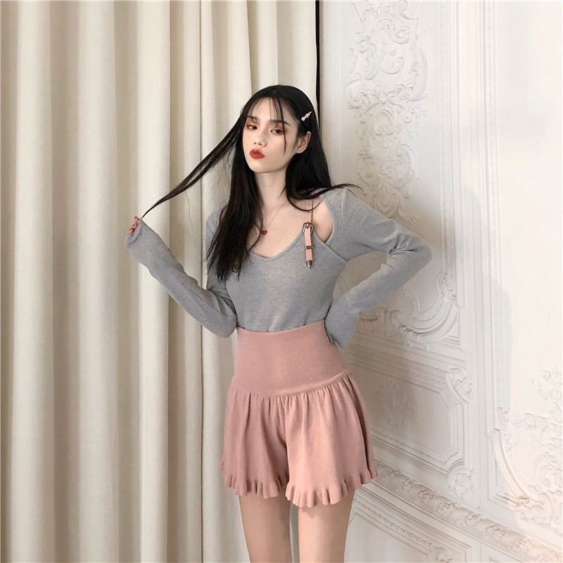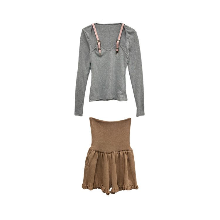 / 韓國復古風女神套裝秋冬款修身顯瘦皮帶拼接打底衫+高腰針織褲裙
