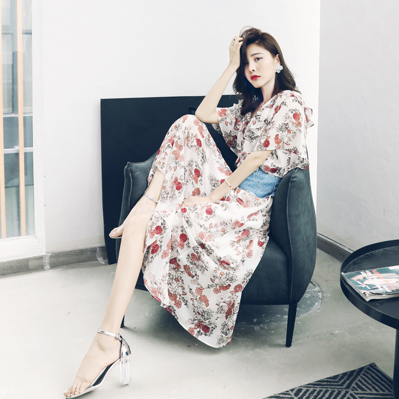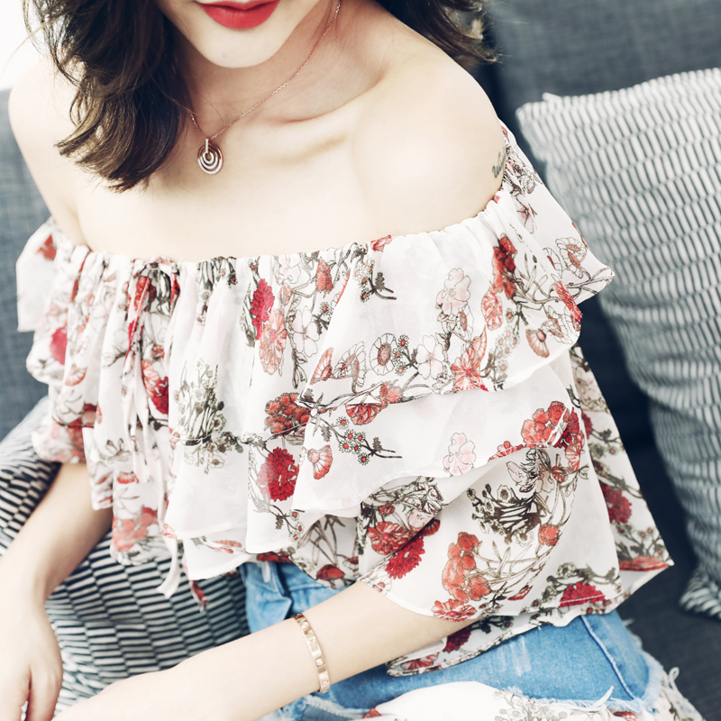 S秀淑女氣質2018夏季新款露肩印花雪紡連衣裙牛仔腰封兩件套潮