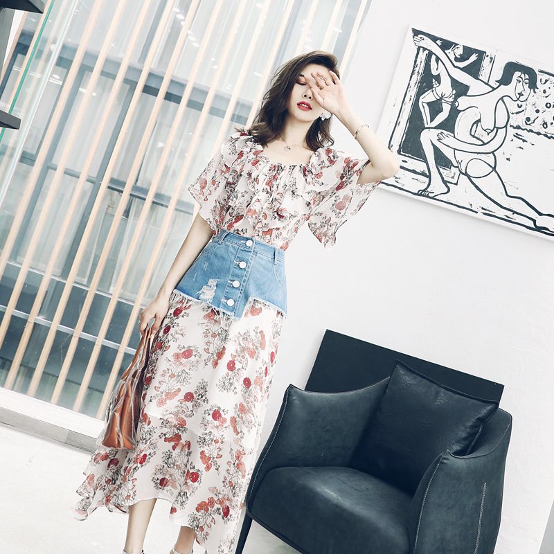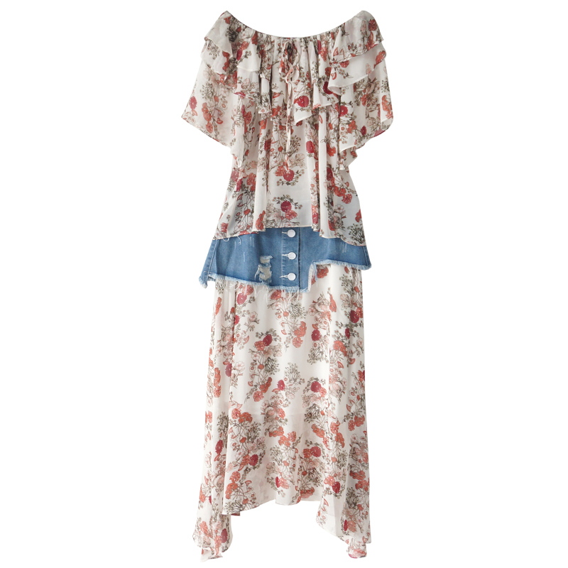 / S秀淑女氣質2018夏季新款露肩印花雪紡連衣裙牛仔腰封兩件套潮