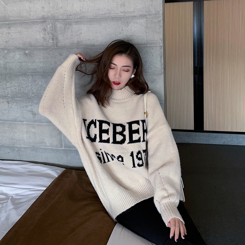 韓版寬松加厚半高領字母毛衣女秋冬2018新款+百搭高腰魚尾半身裙