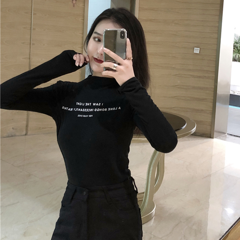 冷系女裝T恤打底衫秋裝新款小高領長袖體恤港味復古修身字母上衣