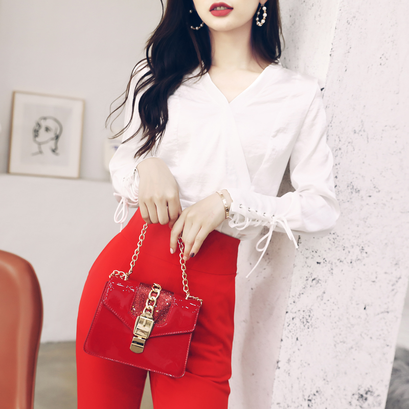 / 港味復古chic風新款韓版V領長袖襯衣高腰顯瘦喇叭褲時尚氣質套裝