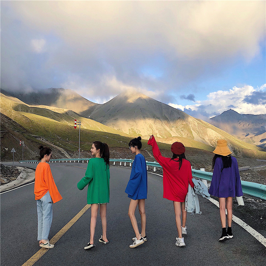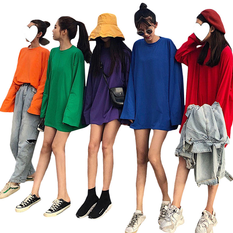 / 秋裝女裝韓版寬松百搭純色圓領T恤中長款長袖休閑顯瘦體恤上衣潮