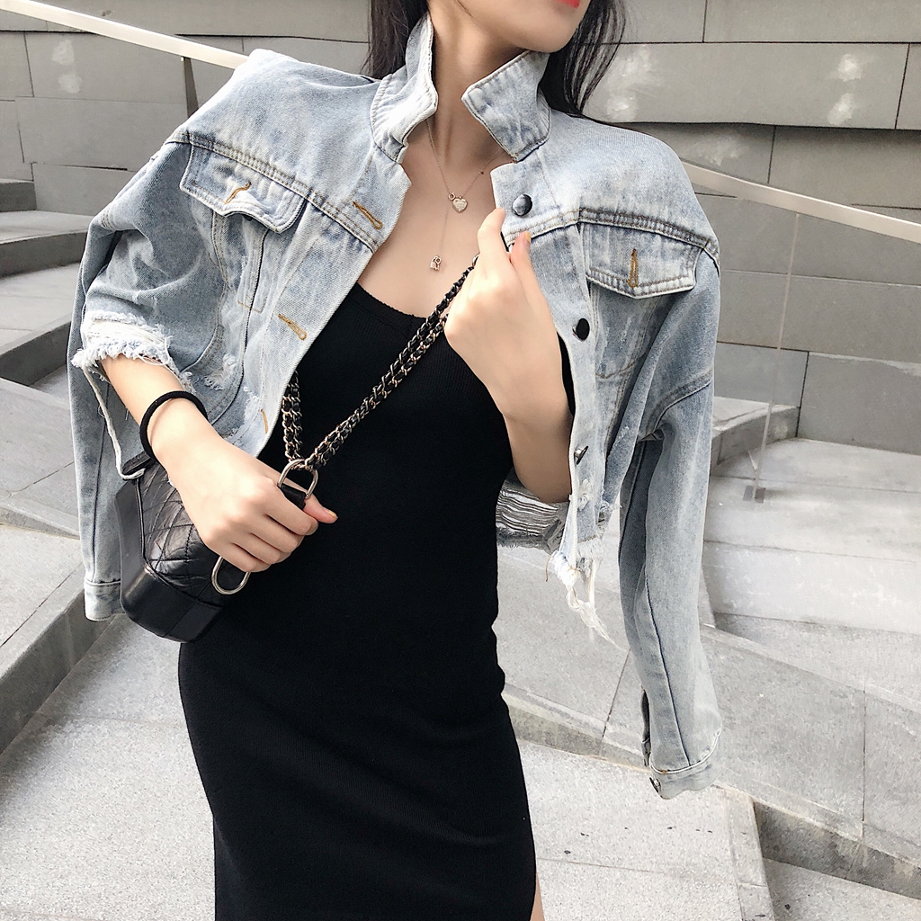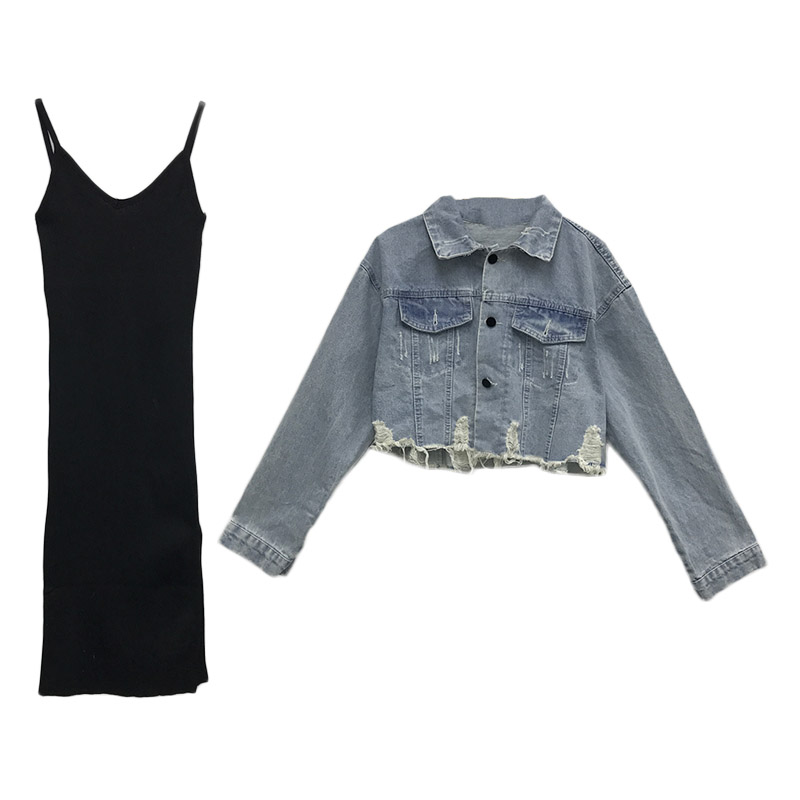 慵懶風秋裝女2018新款復古夾克牛仔外套女春秋+純色V領吊帶連衣裙