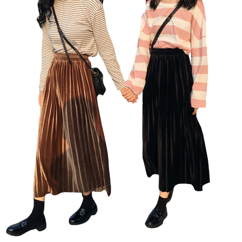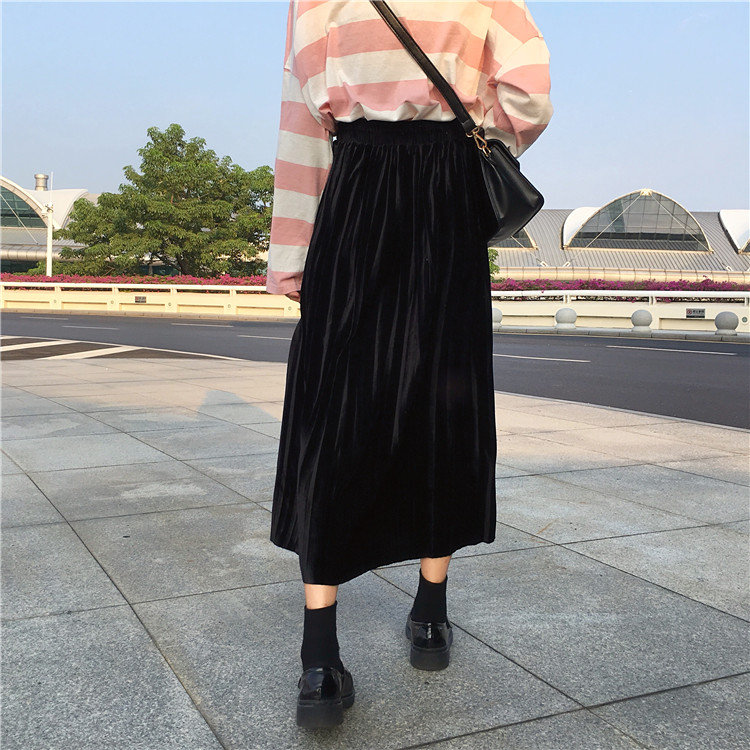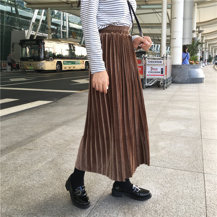 / 秋季女裝韓版復古港味金絲絨百褶裙半身裙高腰A字裙長裙學生裙子