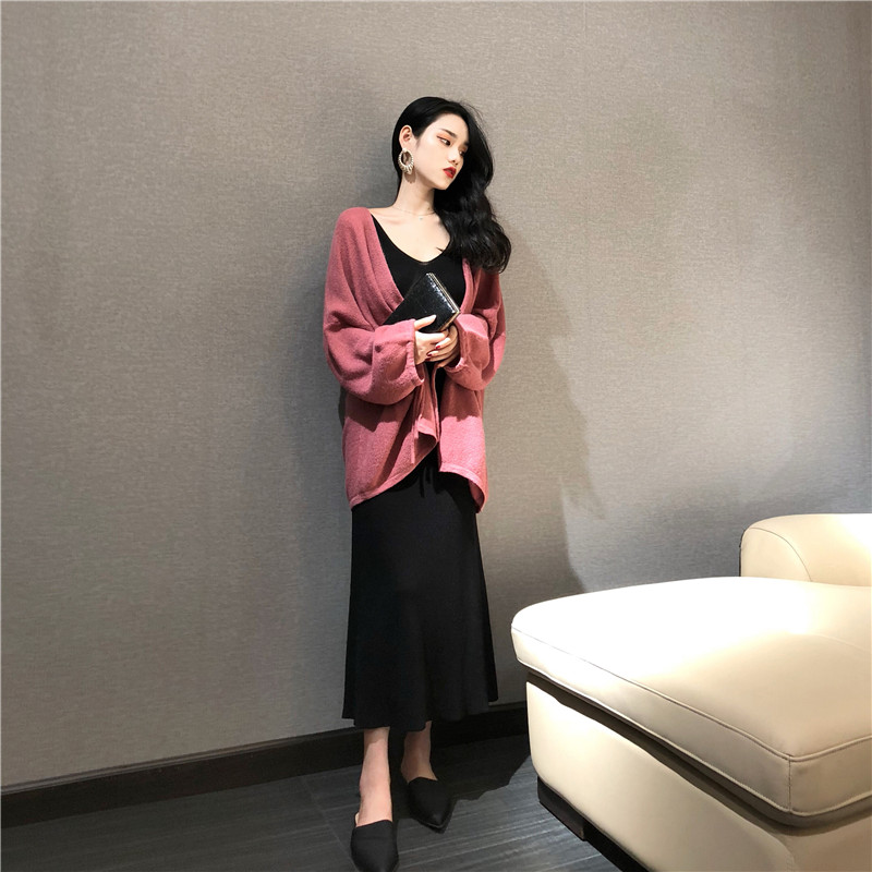 秋裝女2018新款套裝V領針織吊帶連衣裙+慵懶純色毛衣針織開衫外套