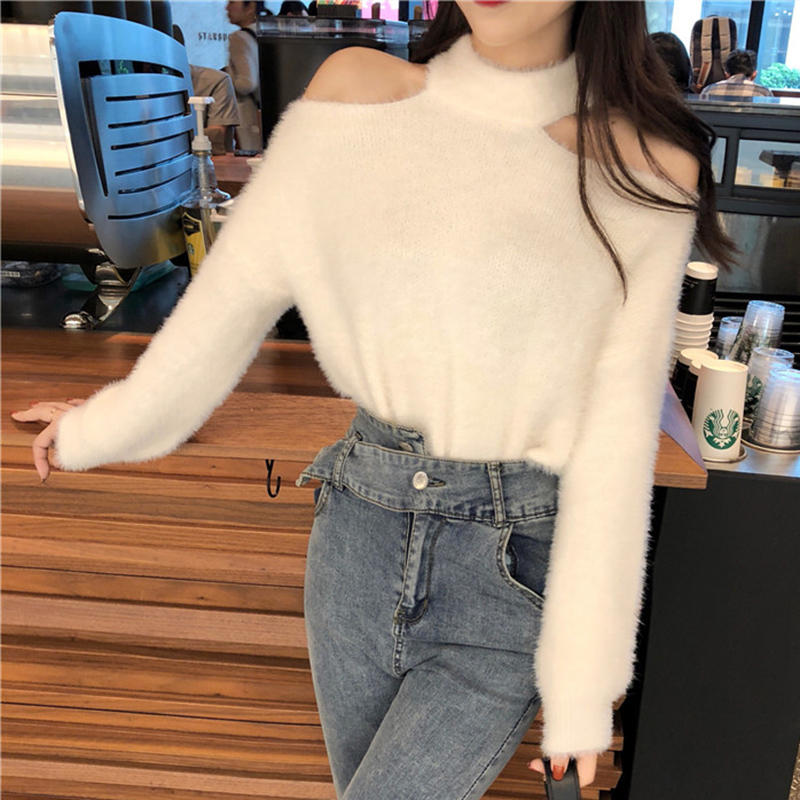 秋冬女裝2018新款心機掛脖露肩長袖毛衣學生氣質白色毛絨針織上衣