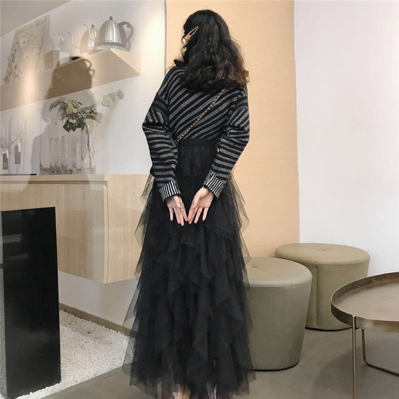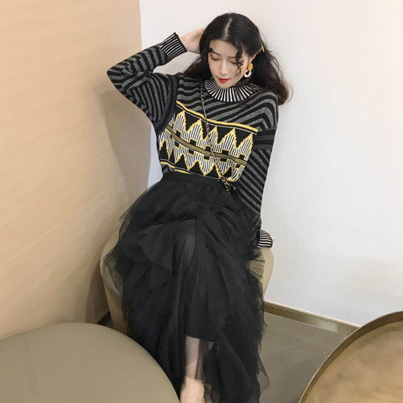 / 時尚套裝女秋冬新款慵懶風條紋毛衣針織外套高腰網紗A字半身裙子