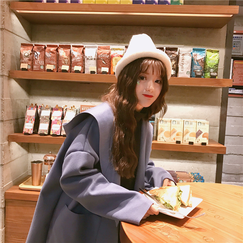 / 秋冬女裝韓版純色寬松呢子大衣中長款連帽赫本風過膝風衣毛呢外套