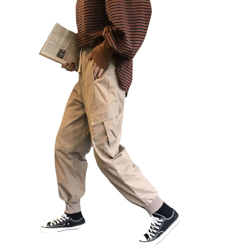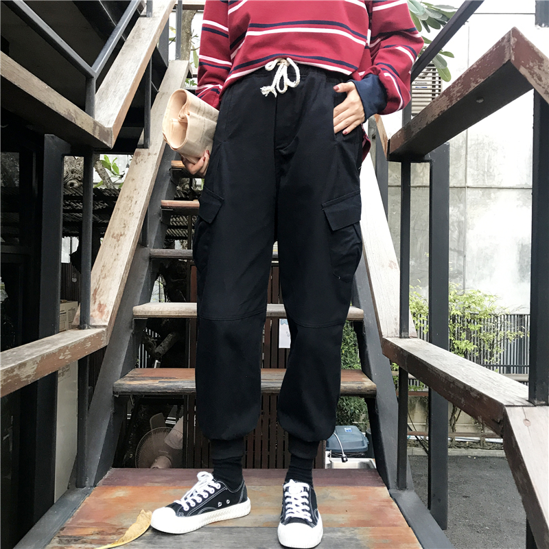 秋冬女裝韓版寬松高腰復古工裝束腳褲松緊腰休閑褲加厚哈倫褲長褲