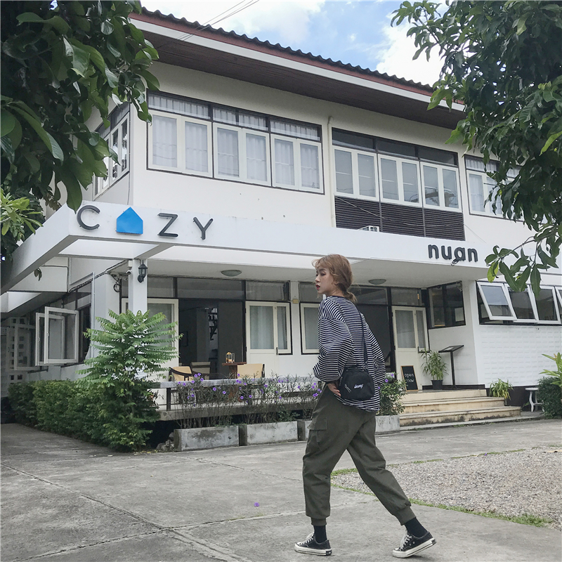 / 秋冬女裝韓版寬松高腰復古工裝束腳褲松緊腰休閑褲加厚哈倫褲長褲