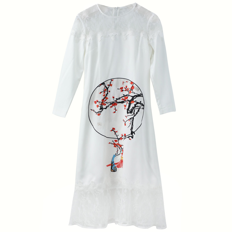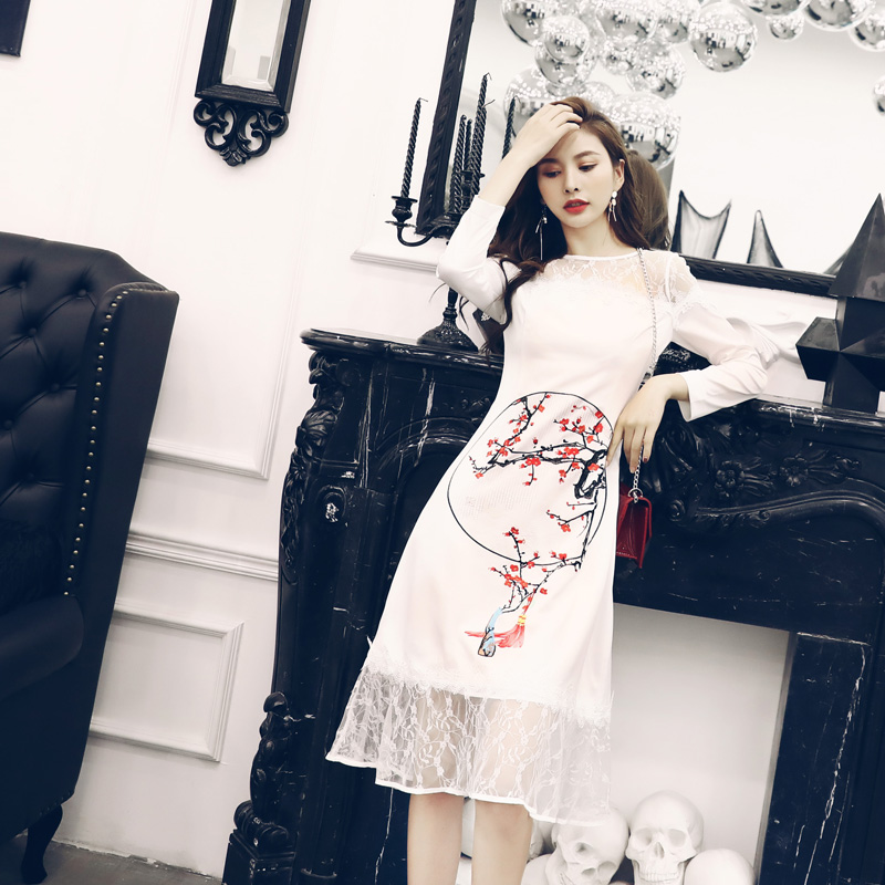 / 2018秋季新款氣質名媛蕾絲拼接長袖重工繡花刺繡中長款連衣裙女潮